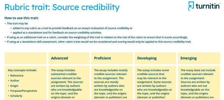 Singular rubric trait for evaluating the credibility of sources in an essay.